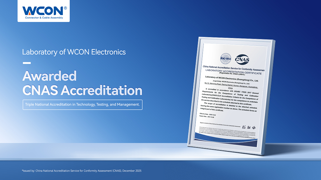 Em 29 de dezembro de 2025, a WCON Electronics Co., Ltd. recebeu formalmente o Certificado de Acreditação de Laboratório CNAS pelo Serviço Nacional de Acreditação da China para Avaliação da Conformidade (CNAS). Isso significa que o centro de testes e experimentos, estabelecido de forma independente pela WCON Electronics , alcançou reconhecimento nacional por suas capacidades técnicas, padrões de gestão e confiabilidade dos resultados de seus testes, demonstrando que seu sistema de gestão de qualidade agora está alinhado com padrões internacionais.